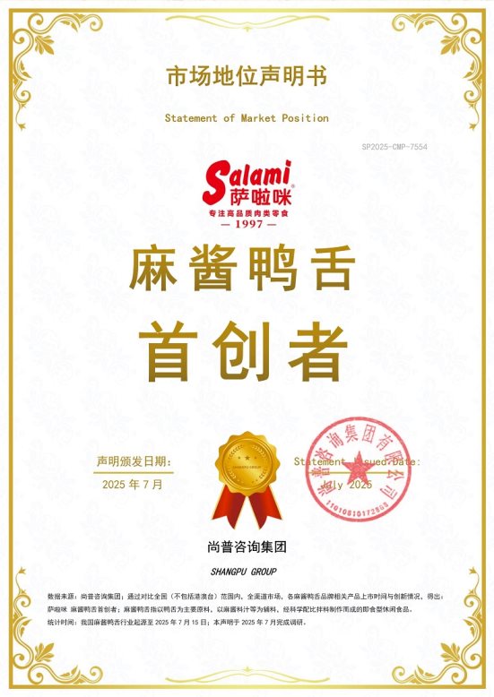 2025年7月,尚普咨询集团向萨啦咪颁发重量级市场地位声明书【萨啦咪 麻酱鸭舌首创者】。该项权威声明,是对萨啦咪定义麻酱鸭舌品类的官方背书,更凸显了市场对其麻酱风味创新价值的肯定。