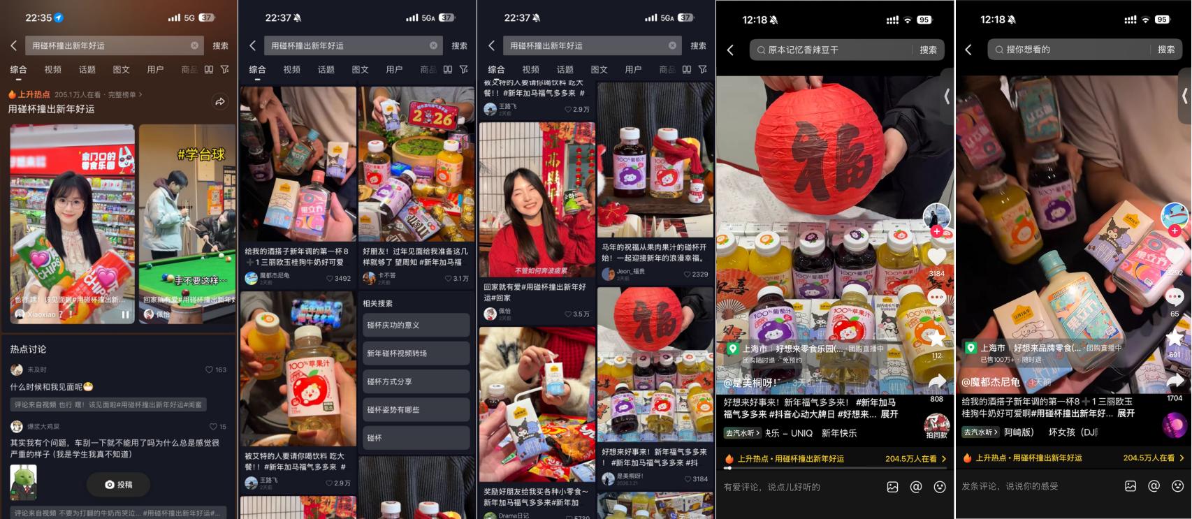 线上互动同样精彩。品牌与平台共创的话题 #用碰杯撞出新年好运#,巧妙地结合了春节“碰杯”的习俗,吸引了大量用户和达人参与拍摄创意视频。话题热度最高达到449.6万,让好想来的新年祝福以一种温暖、有趣的方式刷屏了大家的社交圈。