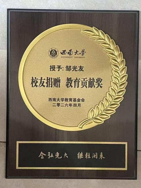 校庆期间,为表彰邹光友与母校长期开展校企合作,及对母校教育事业的长期支持与突出贡献,在全球校友会会长、秘书长暨校友代表大会上,西南大学授予邹光友“校友捐赠教育贡献奖”。
