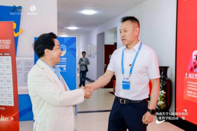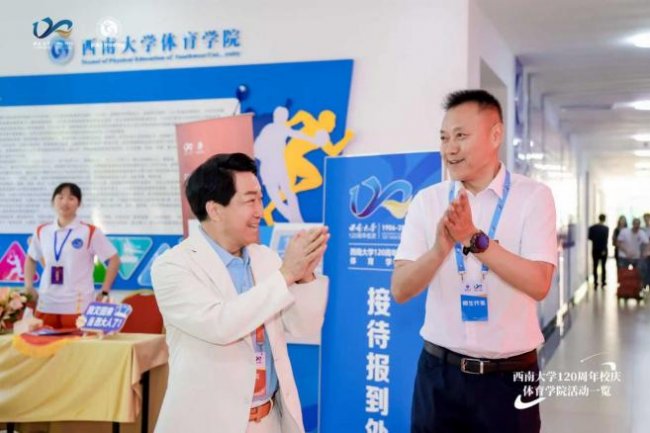 邹光友与西南大学前副校长周光明在校庆大会现场相遇,相互祝贺